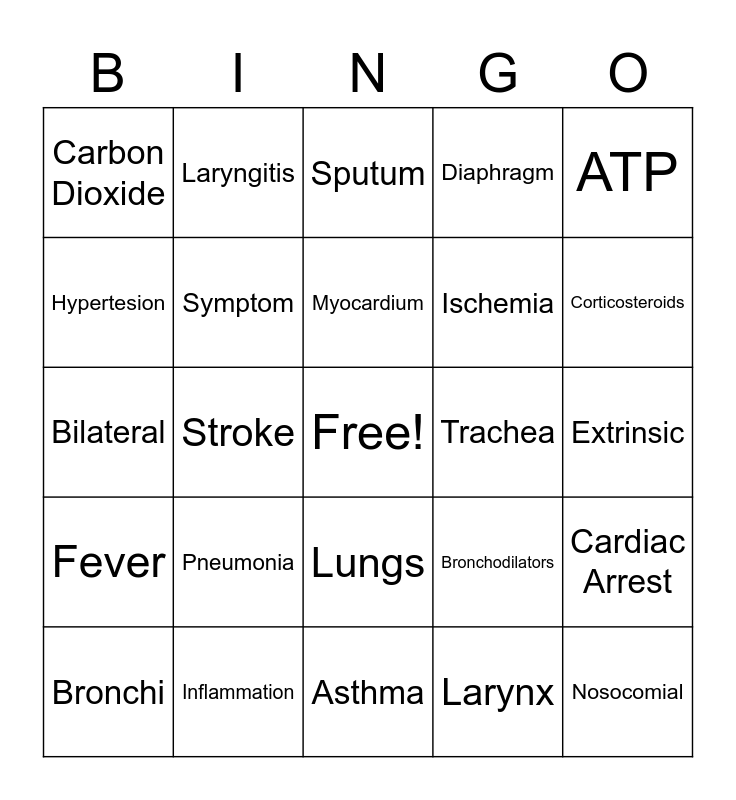 This bingo card has a free space and 44 words: Alveoli, Nosocomial, Epithelial, Bronchi, Pharynx, Larynx, Sputum, Allergens, ATP, Inflammation, Diaphragm, Trachea, Lungs, Pneumonia, Capillaries, Asthma, Unilateral, Bilateral, Dyspnea, Corticosteroids, Laryngitis, Postnural, Cellular Respiration, Carbon Dioxide, Intrinsic, Extrinsic, Antibiotics, Antifungals, Bronchodilators, Fever, Anemia, Cardiac Arrest, Athersclerosis, Heart Attack, Stroke, Defibrillator, Arteries, Veins, Myocardium, Hypertesion, Ischemia, Arrythmia, Symptom and Jaundice.