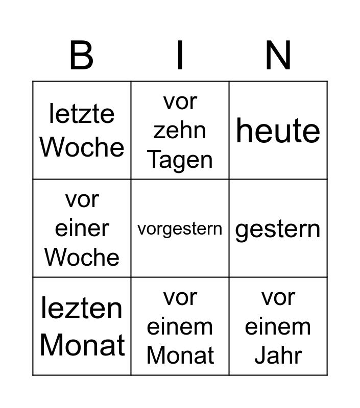 This bingo card has a free space and 8 words: gestern, heute, vor zehn Tagen, lezten Monat, letzte Woche, vor einem Jahr, vor einer Woche and vor einem Monat.
