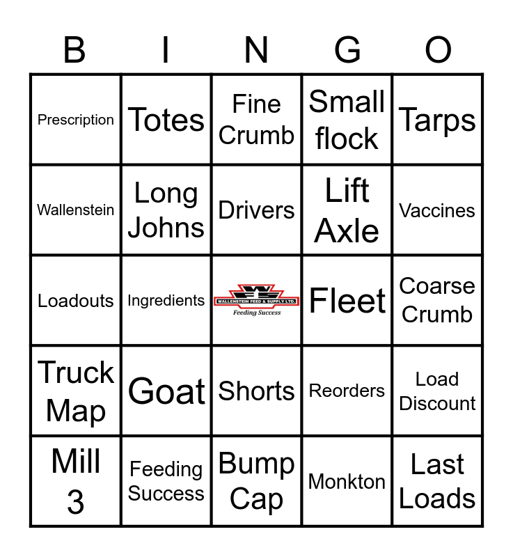 This bingo card has a free space and 100 words: 1958, 5 Axle, Accounts Payable, Accounts Receivable, Air Lock, Bag Order, Bag Truck, Barley, Benefits, Blower Bin, Boiler House, Broiler, Chicken, Coarse Crumb, Compartment, Corn, Bump Cap, Dairy, Dispatch, Distillers, Drag, CSR, Engagement, Farmers, Feed Mill, Feeding Success, Drivers, Fleet, Flock Placement, Fuel Pump, Goat, Fine Crumb, HACCP, HR, I.T., Ingredients, Grain Bank, Kenworth, Last Loads, Layers, Lead & Pony, Innovation, Lift Axle, Load Discount, Loadouts, Long Johns, Leadership, Maintenance, Mill 2, Mill 3, Mill 4, LOT #, Monkton, Nutritionist, Oats, Pellet, Modesty, Poultry, Premix, Prescription, Pricing, Peterbilt, Pullets, Pump House, Purchase Order, Purchasing, Production, Reorders, RRSP’s, Ruminant, Rx, Regular Mash, Safety Vest, Sales, Scale House, Service, Safety, Small flock, Steel Toe Boots, Straight Truck, Swine, Shorts, Tanker, Tarps, Tonnage, Totes, Swipe Card, Trailer, Transport, Truck Map, Truck Wash, Trade Shows, Uniprim, Vaccines, Wallenstein, Western Star, Turkey, Wheat, WinPOPS and WFS.