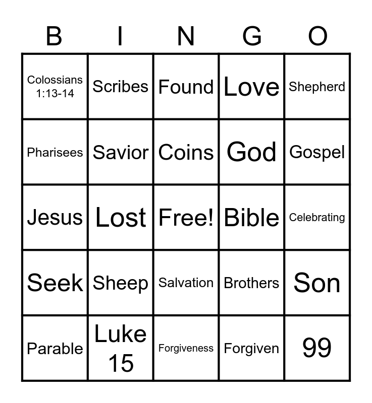 This bingo card has a free space and 24 words: Sheep, Luke 15, Coins, Parable, Shepherd, Colossians 1:13-14, Pharisees, Scribes, Bible, Salvation, God, Jesus, Brothers, Son, Savior, Forgiven, Celebrating, Found, Gospel, Lost, 99, Seek, Love and Forgiveness.