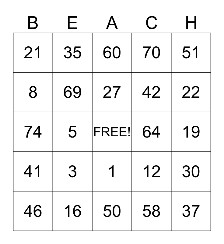 This bingo card has a free space and 24 words: 3, 16, 27, 46, 51, 21, 8, 35, 64, 1, 42, 74, 12, 30, 69, 58, 19, 60, 22, 5, 37, 41, 70 and 50.