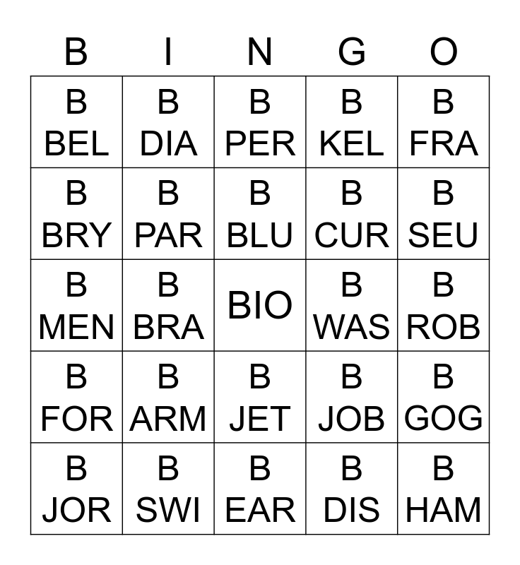 This bingo card has a free space and 29 words: B JOR, B ROW, B BRA, B PRE, B BEL, B PER, B PAR, B ARM, B WAS, B SWI, B ROB, B HAM, B EAR, B DIS, B SEU, B EDI, B JET, B FOR, B FRA, B MEN, B JOB, B KIN, B CUR, B BRY, B KEL, B DIA, B GOG, B BLU and B MOZ.