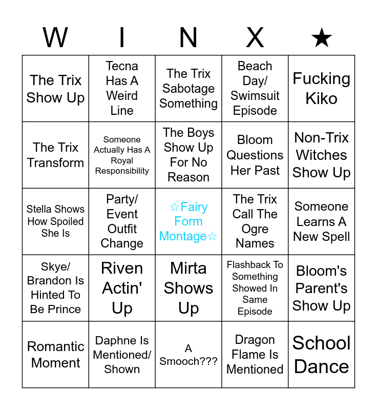 This bingo card has a free space and 24 words: Riven Actin' Up, Daphne Is Mentioned/ Shown, The Boys Show Up For No Reason, Romantic Moment, Fucking Kiko, The Trix Show Up, The Trix Transform, Tecna Has A Weird Line, The Trix Call The Ogre Names, Mirta Shows Up, Bloom Questions Her Past, Stella Shows How Spoiled She Is, Flashback To Something Showed In Same Episode, Bloom's Parent's Show Up, Someone Actually Has A Royal Responsibility, Dragon Flame Is Mentioned, Someone Learns A New Spell, The Trix Sabotage Something, Non-Trix Witches Show Up, Party/ Event Outfit Change, School Dance, Skye/ Brandon Is Hinted To Be Prince, Beach Day/ Swimsuit Episode and A Smooch???.