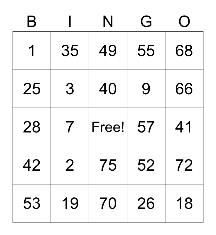 This bingo card has a free space and 24 words: 2, 19, 40, 53, 68, 1, 25, 35, 57, 75, 9, 28, 52, 72, 3, 26, 41, 49, 66, 7, 18, 42, 55 and 70.