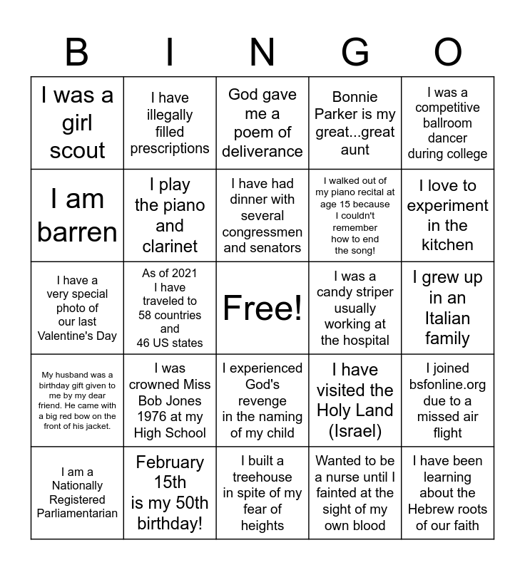 This bingo card has a free space and 24 words: I was crowned Miss Bob Jones 1976 at my High School, February 15th is my 50th birthday!, I have had dinner with several congressmen and senators, I am a Nationally Registered Parliamentarian, I was a competitive ballroom dancer during college, I was a girl scout, I am barren, I have illegally filled prescriptions, I was a candy striper usually working at the hospital, I experienced God's revenge in the naming of my child, I walked out of my piano recital at age 15 because I couldn't remember how to end the song!, I have a very special photo of our last Valentine's Day, I have visited the Holy Land (Israel), I joined bsfonline.org due to a missed air flight, I play the piano and clarinet, Wanted to be a nurse until I fainted at the sight of my own blood, I grew up in an Italian family, God gave me a poem of deliverance, I love to experiment in the kitchen, As of 2021 I have traveled to 58 countries and 46 US states, I have been learning about the Hebrew roots of our faith, My husband was a birthday gift given to me by my dear friend. He came with a big red bow on the front of his jacket., Bonnie Parker is my great...great aunt and I built a treehouse in spite of my fear of heights.