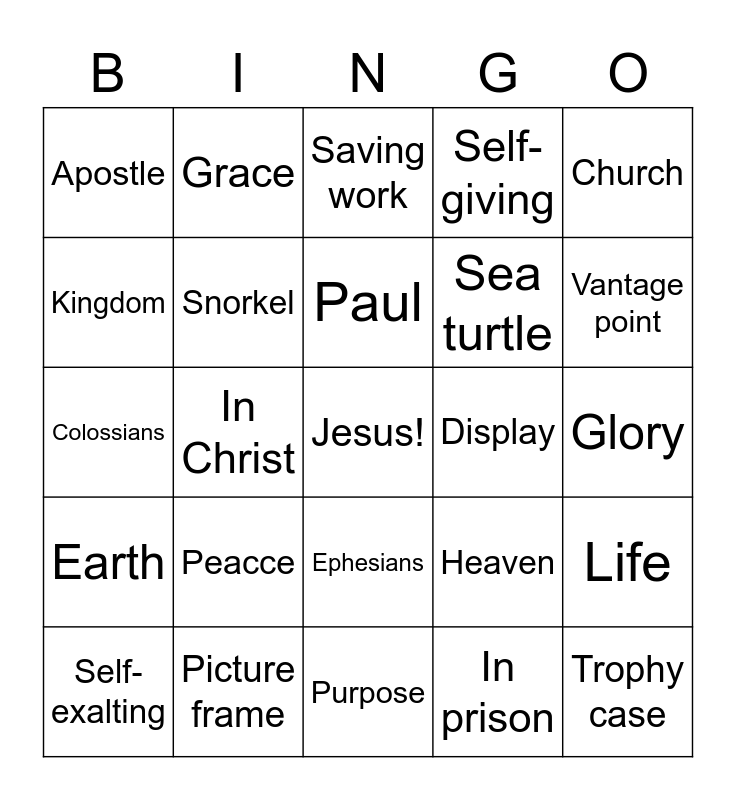This bingo card has a free space and 24 words: Peacce, Picture frame, Paul, Self-exalting, Church, Apostle, Kingdom, Grace, Display, Ephesians, Sea turtle, Colossians, Heaven, Life, Snorkel, In prison, Glory, Saving work, Vantage point, In Christ, Trophy case, Earth, Self-giving and Purpose.