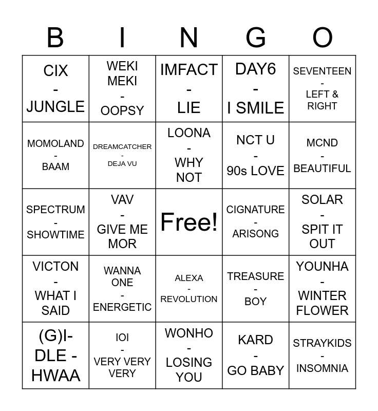 This bingo card has a free space and 24 words: (G)I-DLE - HWAA, WANNA ONE - ENERGETIC, LOONA - WHY NOT, KARD - GO BABY, SEVENTEEN - LEFT & RIGHT, CIX - JUNGLE, WEKI MEKI - OOPSY, IMFACT - LIE, CIGNATURE - ARISONG, SOLAR - SPIT IT OUT, SPECTRUM - SHOWTIME, DREAMCATCHER - DEJA VU, TREASURE - BOY, YOUNHA - WINTER FLOWER, MOMOLAND - BAAM, IOI - VERY VERY VERY, WONHO - LOSING YOU, DAY6 - I SMILE, MCND - BEAUTIFUL, VICTON - WHAT I SAID, VAV - GIVE ME MOR, ALEXA - REVOLUTION, NCT U - 90s LOVE and STRAYKIDS - INSOMNIA.