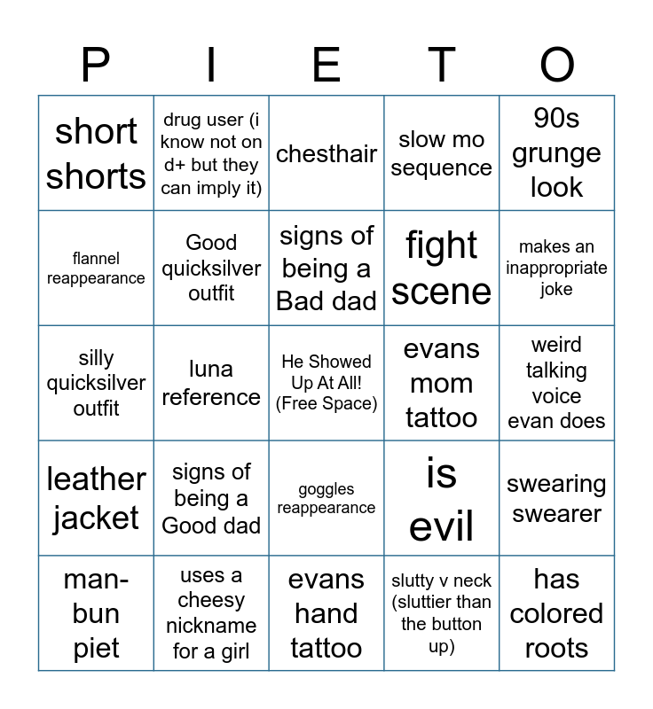 This bingo card has a free space and 24 words: man-bun piet, signs of being a Good dad, signs of being a Bad dad, slutty v neck (sluttier than the button up), 90s grunge look, short shorts, drug user (i know not on d+ but they can imply it), chesthair, evans mom tattoo, weird talking voice evan does, silly quicksilver outfit, Good quicksilver outfit, is evil, swearing swearer, flannel reappearance, uses a cheesy nickname for a girl, evans hand tattoo, slow mo sequence, makes an inappropriate joke, leather jacket, luna reference, goggles reappearance, fight scene and has colored roots.