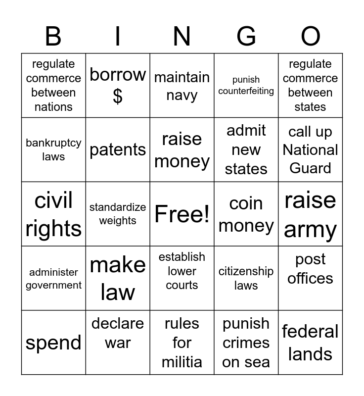 This bingo card has a free space and 24 words: make law, declare war, raise money, spend, regulate commerce between states, regulate commerce between nations, bankruptcy laws, borrow $, coin money, establish lower courts, admit new states, civil rights, citizenship laws, post offices, patents, punish crimes on sea, raise army, maintain navy, call up National Guard, standardize weights, federal lands, administer government, punish counterfeiting and rules for militia.