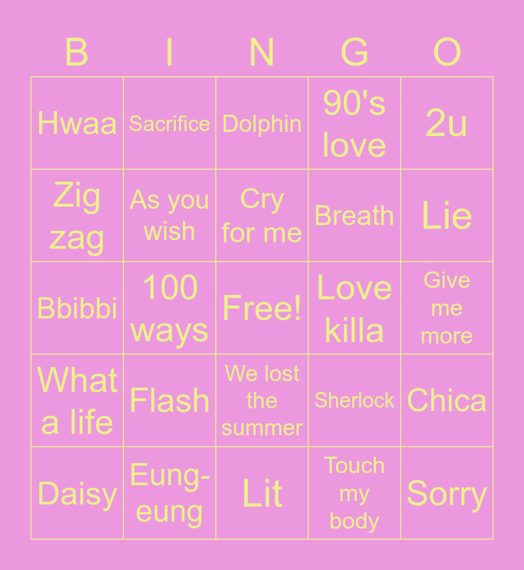 This bingo card has a free space and 35 words: Mago, Twilight, Press your number, As you wish, We lost the summer, 90's love, Zig zag, So bad, Cry for me, Jungle, Bbibbi, 2u, Revolution, Burn it, Hwaa, Love killa, Touch my body, 100 ways, What a life, Sorry, Sherlock, Daisy, Chica, Eung- eung, Dolphin, Lie, Holo, Why not, Breath, Give me more, Happy, Lit, Flash, Sacrifice and Jopping.