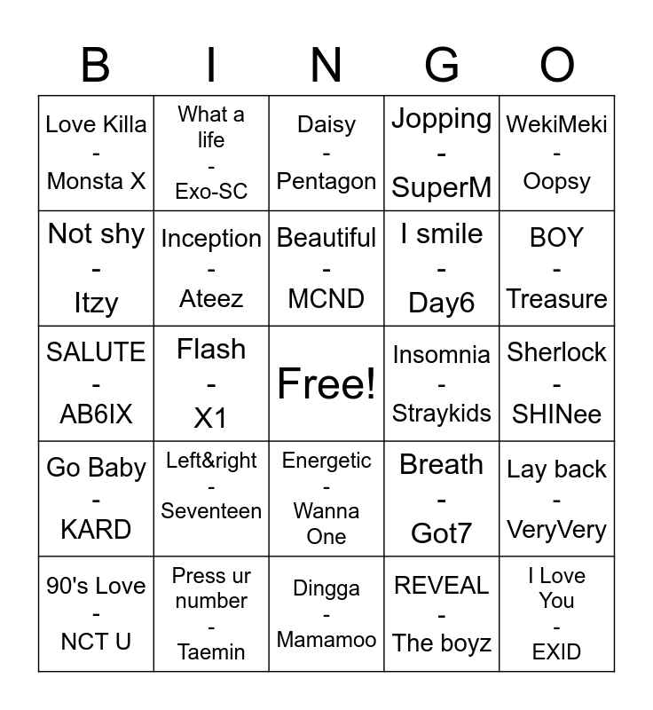 This bingo card has a free space and 24 words: Left&right - Seventeen, Press ur number - Taemin, Beautiful - MCND, 90's Love - NCT U, WekiMeki - Oopsy, Love Killa - Monsta X, Not shy - Itzy, What a life - Exo-SC, Insomnia - Straykids, Energetic - Wanna One, I smile - Day6, SALUTE - AB6IX, Breath - Got7, Lay back - VeryVery, Inception - Ateez, REVEAL - The boyz, Sherlock - SHINee, Daisy - Pentagon, BOY - Treasure, Flash - X1, I Love You - EXID, Go Baby - KARD, Jopping - SuperM and Dingga - Mamamoo.