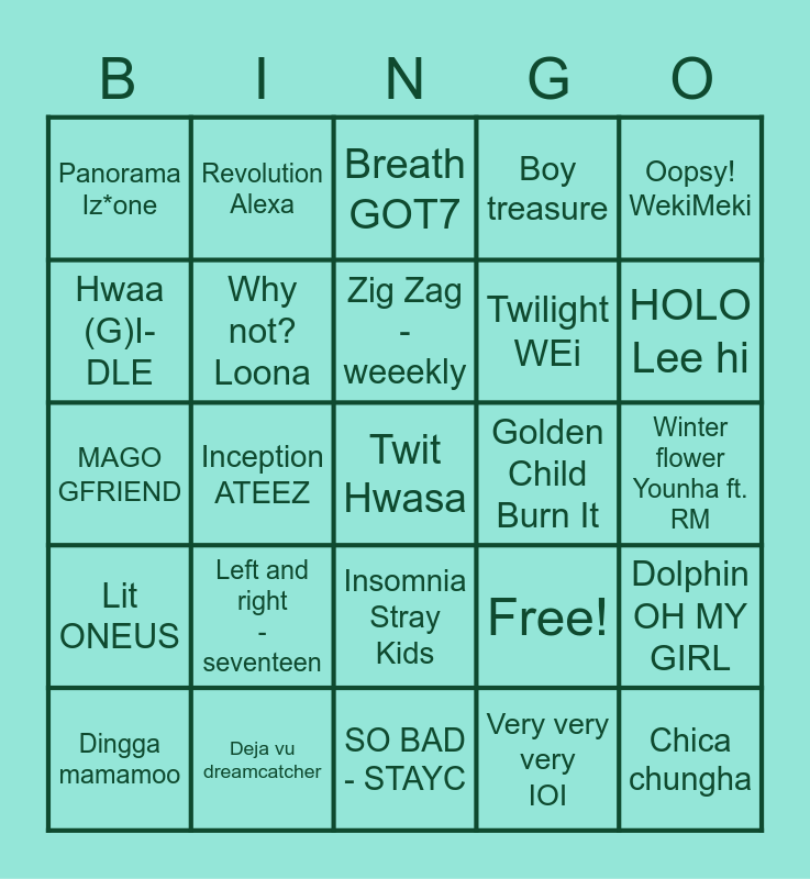 This bingo card has 25 words: Left and right - seventeen, SO BAD - STAYC, Zig Zag - weeekly, Dingga mamamoo, Oopsy! WekiMeki, Panorama Iz*one, Hwaa (G)I-DLE, Revolution Alexa, Golden Child Burn It, Insomnia Stray Kids, Twilight WEi, MAGO GFRIEND, Free!, Dolphin OH MY GIRL, Why not? Loona, Chica chungha, Winter flower Younha ft. RM, Breath GOT7, HOLO Lee hi, Inception ATEEZ, Twit Hwasa, Deja vu dreamcatcher, Lit ONEUS, Boy treasure and Very very very IOI.