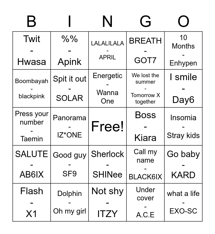 This bingo card has a free space and 24 words: Good guy - SF9, Dolphin - Oh my girl, Energetic - Wanna One, Flash - X1, 10 Months - Enhypen, Twit - Hwasa, Boombayah - blackpink, %% - Apink, Boss - Kiara, Sherlock - SHINee, We lost the summer - Tomorrow X together, Press your number - Taemin, Call my name - BLACK6IX, Go baby - KARD, Spit it out - SOLAR, Under cover - A.C.E, Insomia - Stray kids, LALALILALA - APRIL, I smile - Day6, Panorama - IZ*ONE, what a life - EXO-SC, SALUTE - AB6IX, BREATH - GOT7 and Not shy - ITZY.