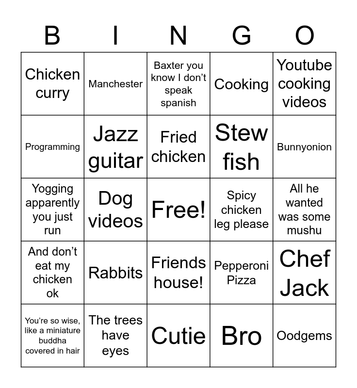 This bingo card has a free space and 51 words: Bunyip, Oodgems, Munchkin, Cutie, Rabbits, Drum & Bass, Manchester, Maths, Programming, Avios, Jazz guitar, Cooking, Chef Jack, Pepperoni Pizza, Garlic and herb dip, Fried rice master, Fried chicken, Spicy chicken leg please, Banana cake, Youtube cooking videos, Dog videos, Bro, Chicken curry, Stew fish, Wok, Whammy!, Bunnyonion, Springy onions, You’re so wise, like a miniature buddha covered in hair, Baxter you know I don’t speak spanish, Dhall belly bai, You say what, I don’t believe!, Brother bear, Here come the meat sweats, Sorry you can’t get to sleep, cos your head keeps moving, The trees have eyes, Check and chester, Cheap suit cheap suit, Rush hour 1 & 2, Kefilke fish, All he wanted was some mushu, And don’t eat my chicken ok, I always dream to square marden, Trivium, Fluffy pink slippers, Spongebob squarepants, Yogging apparently you just run, You have to pay for your pizza, sir, Too bad Johnny ain't in charge no more!, Friends house! and Chicken? I could eat some chicken.