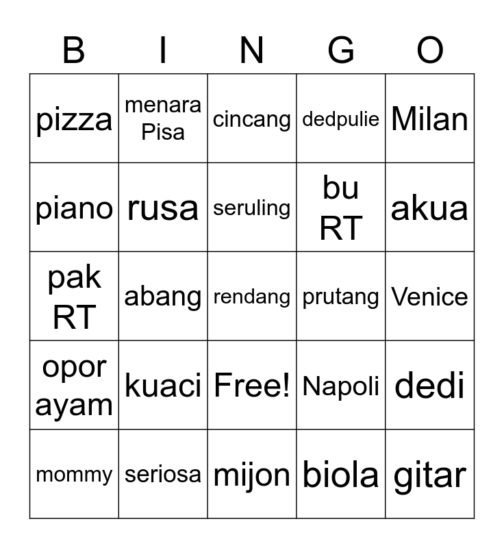 This bingo card has 26 words: Free!, biola, seruling, seriosa, Milan, pizza, piano, menara Pisa, Venice, Napoli, bu RT, pak RT, dedi, mommy, abang, om, dedpulie, opor ayam, cincang, rendang, akua, mijon, prutang, kuaci, rusa and gitar.