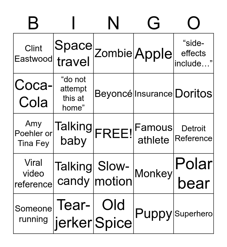 This bingo card has a free space and 33 words: High speed chase, Talking animals, Talking baby, Pepsi, Viral video reference, “do not attempt this at home”, “side-effects include…”, Someone running, Space travel, A song from the 90s, Beyoncé, Zombie, Clydesdale Horse, Pizza delivery guy, Famous athlete, Doritos, Tear-jerker, Amy Poehler or Tina Fey, Talking candy, Monkey, Slow-motion, Country Song, Clint Eastwood, Detroit Reference, Old Spice, Superhero, Apple, Insurance, Coca-Cola, Polar bear, Taylor Swift, Puppy and Kitten.