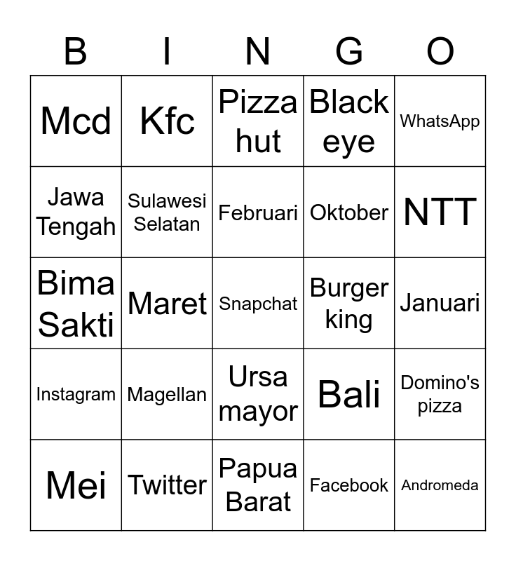 This bingo card has 25 words: Instagram, Twitter, Snapchat, Facebook, WhatsApp, Mcd, Kfc, Pizza hut, Burger king, Domino's pizza, Jawa Tengah, Sulawesi Selatan, Papua Barat, Bali, NTT, Mei, Maret, Februari, Oktober, Januari, Bima Sakti, Magellan, Ursa mayor, Black eye and Andromeda.