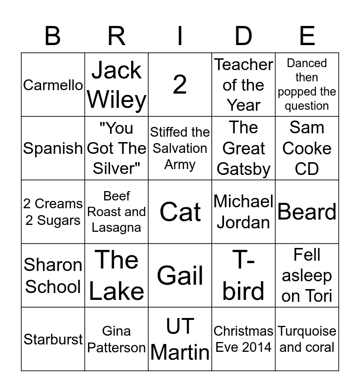 This bingo card has a free space and 24 words: The Lake, Gina Patterson, Stiffed the Salvation Army, Starburst, Danced then popped the question, Carmello, Spanish, Jack Wiley, Michael Jordan, Gail, The Great Gatsby, 2 Creams 2 Sugars, T-bird, Fell asleep on Tori, "You Got The Silver", Christmas Eve 2014, Beard, 2, Sam Cooke CD, Beef Roast and Lasagna, Turquoise and coral, Sharon School, Teacher of the Year and UT Martin.