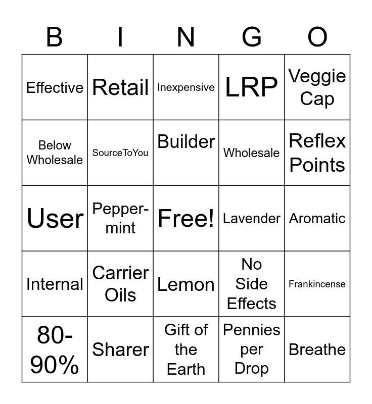 This bingo card has a free space and 31 words: Gift of the Earth, 50-70 times, Pepper-mint, Safe, Effective, Inexpensive, SourceToYou, No Side Effects, Lavender, Pennies per Drop, Aromatic, Breathe, On Guard, Topical, Reflex Points, Deep Blue, Frankincense, Carrier Oils, Internal, Lemon, Veggie Cap, LLV, 80-90%, Retail, Wholesale, Below Wholesale, LRP, User, Sharer, Builder and CPTG.
