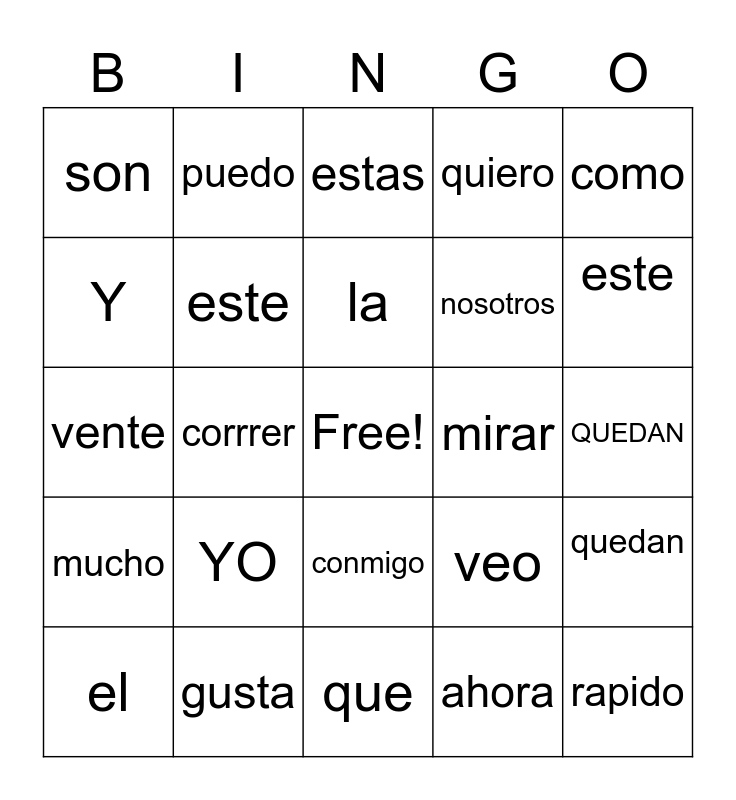 This bingo card has a free space and 24 words: YO, gusta, la, el, como, son, Y, puedo, mirar, conmigo, nosotros, vente, veo, quedan, este, ahora, QUEDAN, estas, este, corrrer, rapido, mucho, quiero and que.