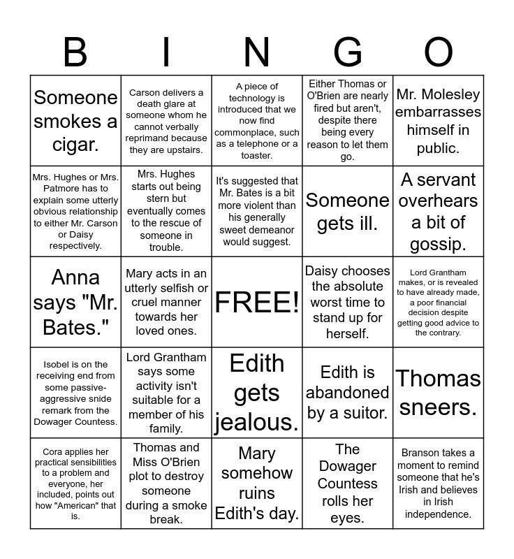This bingo card has a free space and 24 words: Lord Grantham says some activity isn't suitable for a member of his family., Thomas and Miss O'Brien plot to destroy someone during a smoke break., It's suggested that Mr. Bates is a bit more violent than his generally sweet demeanor would suggest., Cora applies her practical sensibilities to a problem and everyone, her included, points out how "American" that is., Mr. Molesley embarrasses himself in public., Someone smokes a cigar., Mrs. Hughes or Mrs. Patmore has to explain some utterly obvious relationship to either Mr. Carson or Daisy respectively., Carson delivers a death glare at someone whom he cannot verbally reprimand because they are upstairs., Daisy chooses the absolute worst time to stand up for herself., Edith gets jealous., Someone gets ill., Anna says "Mr. Bates.", Edith is abandoned by a suitor., Thomas sneers., Mrs. Hughes starts out being stern but eventually comes to the rescue of someone in trouble., The Dowager Countess rolls her eyes., Lord Grantham makes, or is revealed to have already made, a poor financial decision despite getting good advice to the contrary., A piece of technology is introduced that we now find commonplace, such as a telephone or a toaster., A servant overhears a bit of gossip., Mary acts in an utterly selfish or cruel manner towards her loved ones., Branson takes a moment to remind someone that he's Irish and believes in Irish independence., Isobel is on the receiving end from some passive-aggressive snide remark from the Dowager Countess., Either Thomas or O'Brien are nearly fired but aren't, despite there being every reason to let them go. and Mary somehow ruins Edith's day..