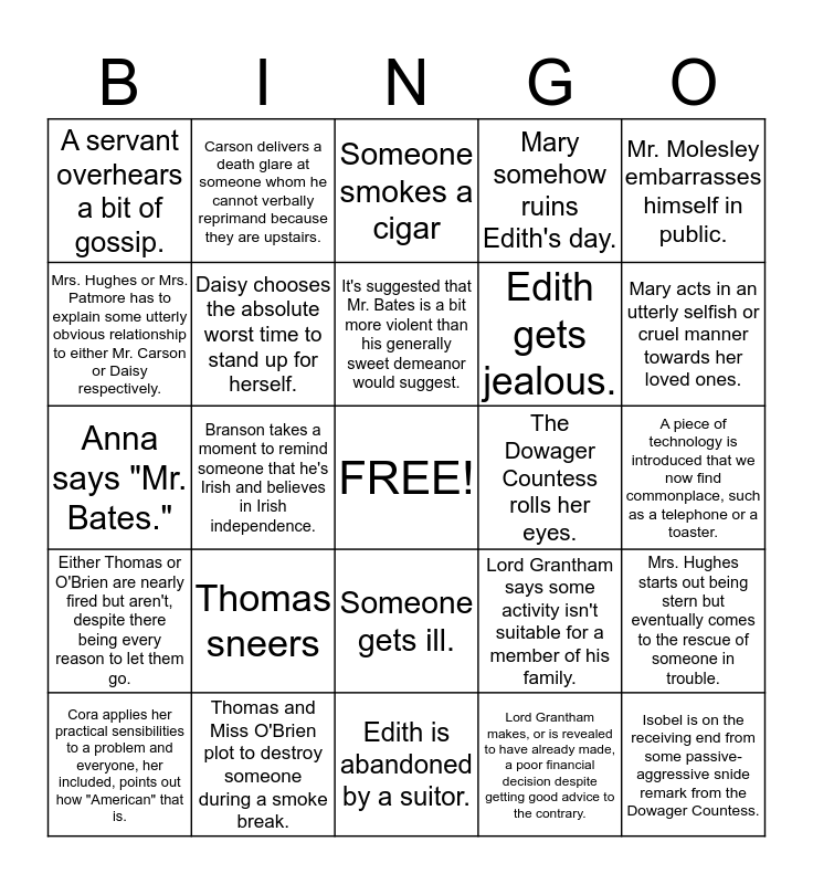 This bingo card has a free space and 24 words: Thomas sneers, Thomas and Miss O'Brien plot to destroy someone during a smoke break., It's suggested that Mr. Bates is a bit more violent than his generally sweet demeanor would suggest., Cora applies her practical sensibilities to a problem and everyone, her included, points out how "American" that is., Mr. Molesley embarrasses himself in public., A servant overhears a bit of gossip., Mrs. Hughes or Mrs. Patmore has to explain some utterly obvious relationship to either Mr. Carson or Daisy respectively., Carson delivers a death glare at someone whom he cannot verbally reprimand because they are upstairs., The Dowager Countess rolls her eyes., Someone gets ill., Edith gets jealous., Anna says "Mr. Bates.", Lord Grantham says some activity isn't suitable for a member of his family., Mrs. Hughes starts out being stern but eventually comes to the rescue of someone in trouble., Daisy chooses the absolute worst time to stand up for herself., Lord Grantham makes, or is revealed to have already made, a poor financial decision despite getting good advice to the contrary., A piece of technology is introduced that we now find commonplace, such as a telephone or a toaster., Someone smokes a cigar, Mary acts in an utterly selfish or cruel manner towards her loved ones., Branson takes a moment to remind someone that he's Irish and believes in Irish independence., Isobel is on the receiving end from some passive-aggressive snide remark from the Dowager Countess., Either Thomas or O'Brien are nearly fired but aren't, despite there being every reason to let them go., Mary somehow ruins Edith's day. and Edith is abandoned by a suitor..