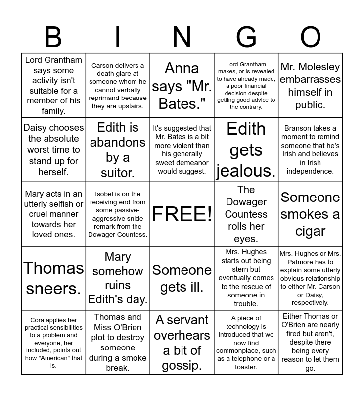This bingo card has a free space and 24 words: Mary somehow ruins Edith's day., Thomas and Miss O'Brien plot to destroy someone during a smoke break., It's suggested that Mr. Bates is a bit more violent than his generally sweet demeanor would suggest., Cora applies her practical sensibilities to a problem and everyone, her included, points out how "American" that is., Mr. Molesley embarrasses himself in public., Lord Grantham says some activity isn't suitable for a member of his family., Daisy chooses the absolute worst time to stand up for herself., Carson delivers a death glare at someone whom he cannot verbally reprimand because they are upstairs., The Dowager Countess rolls her eyes., Someone gets ill., Edith gets jealous., Mary acts in an utterly selfish or cruel manner towards her loved ones., Mrs. Hughes starts out being stern but eventually comes to the rescue of someone in trouble., Mrs. Hughes or Mrs. Patmore has to explain some utterly obvious relationship to either Mr. Carson or Daisy, respectively., Edith is abandons by a suitor., A piece of technology is introduced that we now find commonplace, such as a telephone or a toaster., Someone smokes a cigar, Anna says "Mr. Bates.", Branson takes a moment to remind someone that he's Irish and believes in Irish independence., Isobel is on the receiving end from some passive-aggressive snide remark from the Dowager Countess., Either Thomas or O'Brien are nearly fired but aren't, despite there being every reason to let them go., Thomas sneers., Lord Grantham makes, or is revealed to have already made, a poor financial decision despite getting good advice to the contrary. and A servant overhears a bit of gossip..