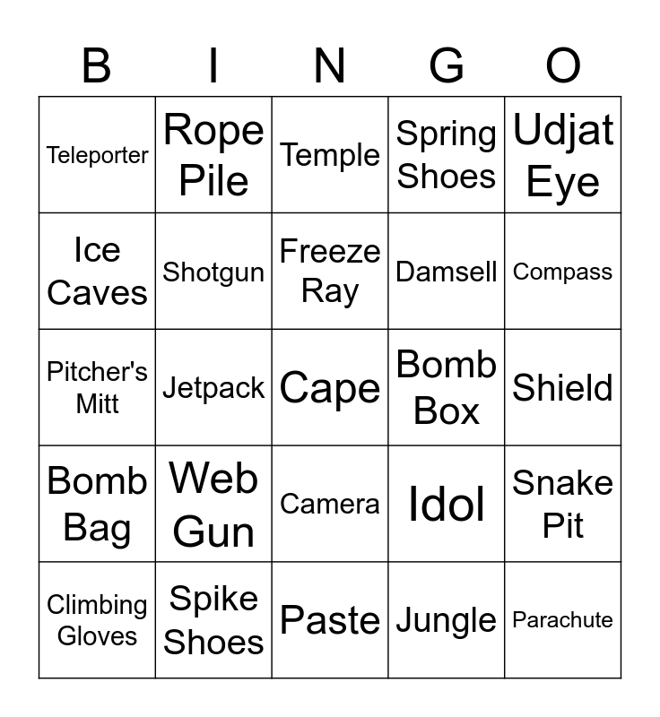 This bingo card has 28 words: Snake Pit, Dice Game, Damsell, Jungle, Ice Caves, Temple, Rope Pile, Bomb Bag, Bomb Box, Climbing Gloves, Pitcher's Mitt, Spring Shoes, Spike Shoes, Paste, Compass, Machete, Web Gun, Shotgun, Freeze Ray, Camera, Teleporter, Parachute, Cape, Jetpack, Shield, Idol, Udjat Eye and Pickaxe.