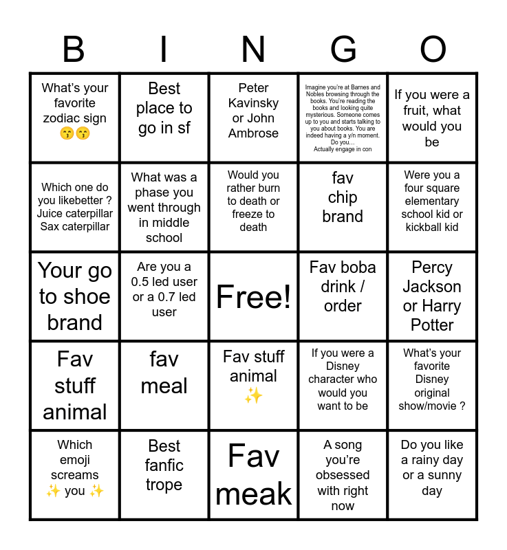 This bingo card has a free space and 24 words: fav meal, Best fanfic trope, Would you rather burn to death or freeze to death, Which emoji screams ✨ you ✨, If you were a fruit, what would you be, What’s your favorite zodiac sign 😙😙, Which one do you likebetter ? Juice caterpillar Sax caterpillar, Best place to go in sf, Fav boba drink / order, Fav stuff animal ✨, fav chip brand, Your go to shoe brand, If you were a Disney character who would you want to be, What’s your favorite Disney original show/movie ?, What was a phase you went through in middle school, A song you’re obsessed with right now, Percy Jackson or Harry Potter, Peter Kavinsky or John Ambrose, Were you a four square elementary school kid or kickball kid, Are you a 0.5 led user or a 0.7 led user, Do you like a rainy day or a sunny day, Fav stuff animal, Imagine you’re at Barnes and Nobles browsing through the books. You’re reading the books and looking quite mysterious. Someone comes up to you and starts talking to you about books. You are indeed having a y/n moment. Do you… Actually engage in con and Fav meak.