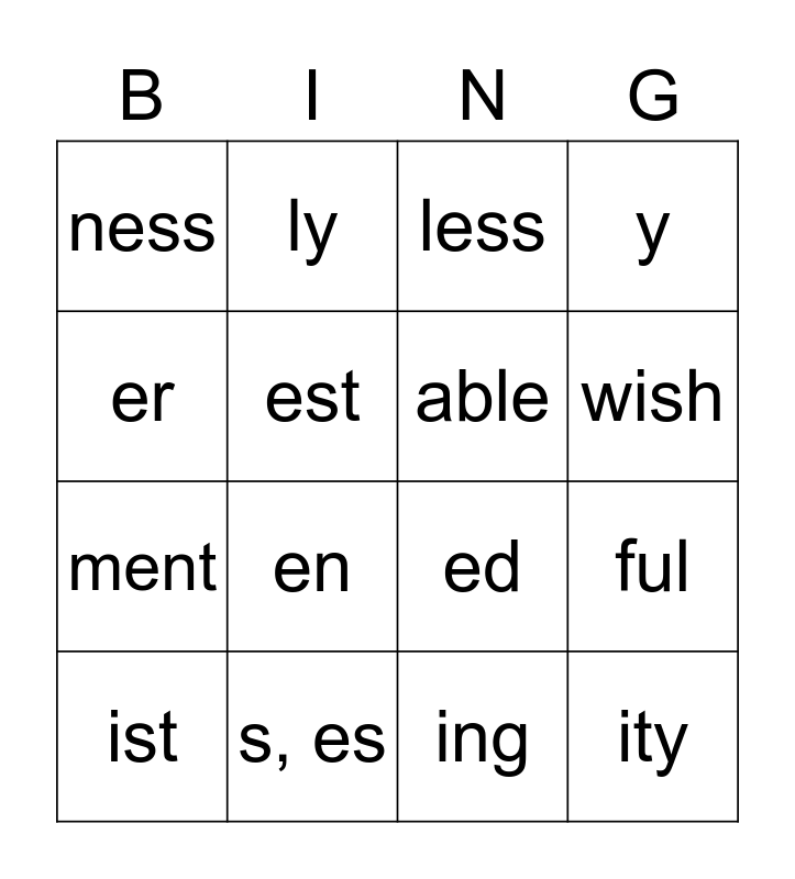 This bingo card has 16 words: s, es, ful, less, ness, ment, ly, ed, ing, er, est, ist, y, en, wish, able and ity.