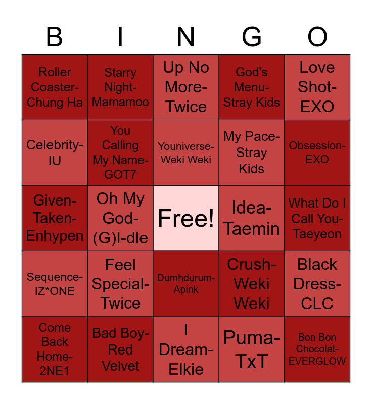 This bingo card has a free space and 24 words: Feel Special- Twice, Bad Boy- Red Velvet, Youniverse- Weki Weki, Come Back Home- 2NE1, Love Shot- EXO, Roller Coaster- Chung Ha, Celebrity- IU, Starry Night- Mamamoo, Idea- Taemin, Dumhdurum- Apink, My Pace- Stray Kids, Given-Taken- Enhypen, Crush- Weki Weki, Black Dress- CLC, You Calling My Name- GOT7, Puma- TxT, What Do I Call You- Taeyeon, Up No More- Twice, Obsession- EXO, Oh My God- (G)I-dle, Bon Bon Chocolat- EVERGLOW, Sequence- IZ*ONE, God's Menu- Stray Kids and I Dream- Elkie.