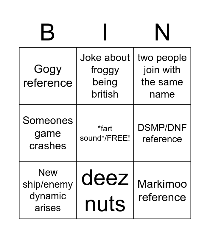 This bingo card has a free space and 8 words: DSMP/DNF reference, two people join with the same name, Joke about froggy being british, New ship/enemy dynamic arises, Gogy reference, Markimoo reference, Someones game crashes and deez nuts.