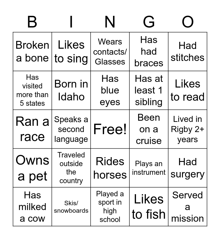 This bingo card has a free space and 24 words: Traveled outside the country, Skis/ snowboards, Has blue eyes, Has milked a cow, Had stitches, Broken a bone, Has visited more than 5 states, Likes to sing, Been on a cruise, Rides horses, Has at least 1 sibling, Ran a race, Plays an instrument, Had surgery, Born in Idaho, Likes to fish, Lived in Rigby 2+ years, Wears contacts/ Glasses, Likes to read, Speaks a second language, Served a mission, Owns a pet, Has had braces and Played a sport in high school.