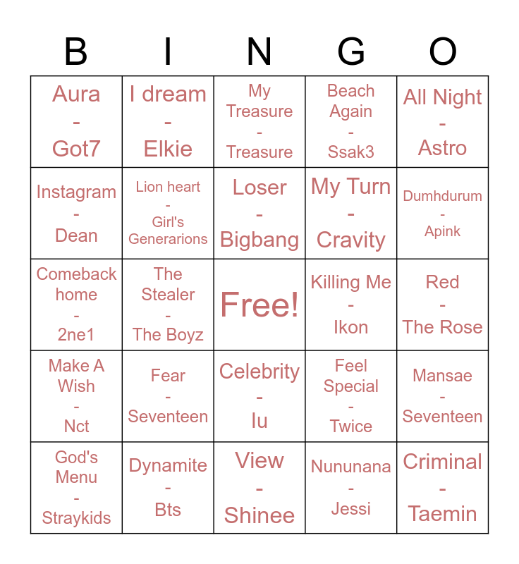 This bingo card has a free space and 24 words: Fear - Seventeen, Dynamite - Bts, Loser - Bigbang, God's Menu - Straykids, All Night - Astro, Aura - Got7, Instagram - Dean, I dream - Elkie, Killing Me - Ikon, Celebrity - Iu, My Turn - Cravity, Comeback home - 2ne1, Feel Special - Twice, Mansae - Seventeen, Lion heart - Girl's Generarions, Nununana - Jessi, Red - The Rose, My Treasure - Treasure, Dumhdurum - Apink, The Stealer - The Boyz, Criminal - Taemin, Make A Wish - Nct, Beach Again - Ssak3 and View - Shinee.
