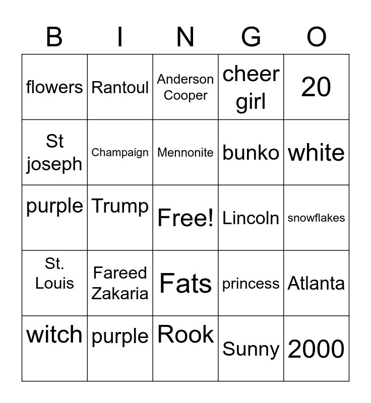 This bingo card has a free space and 24 words: Fareed Zakaria, purple, Mennonite, witch, 20, flowers, St joseph, Rantoul, Lincoln, Fats, bunko, purple, princess, Atlanta, Champaign, Sunny, snowflakes, Anderson Cooper, white, Trump, 2000, St. Louis, cheer girl and Rook.