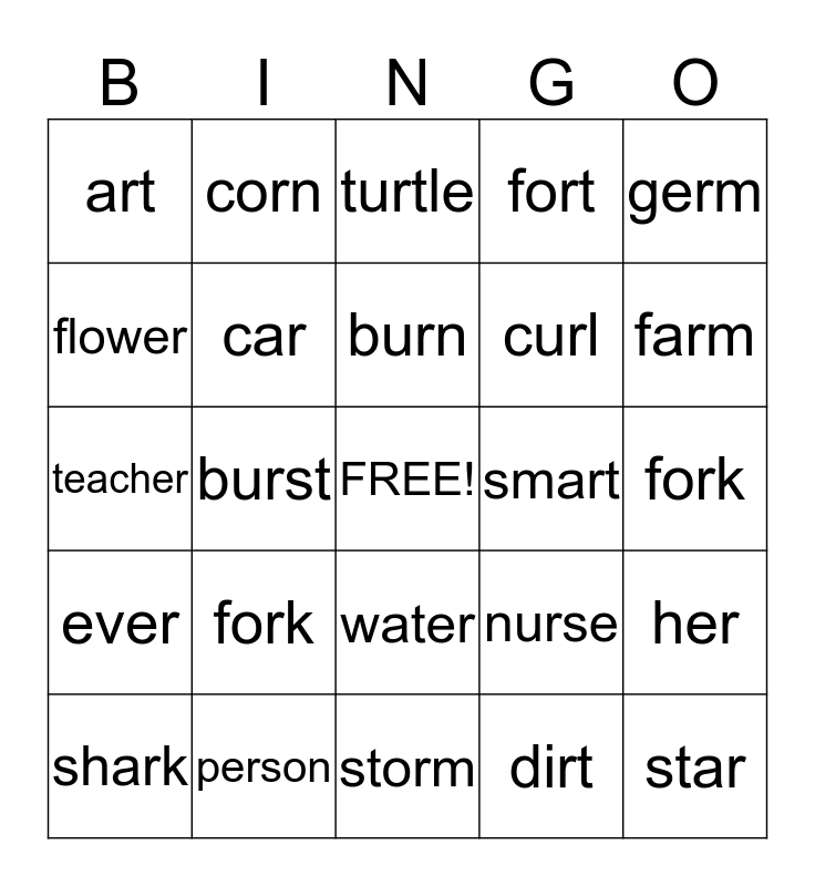 This bingo card has a free space and 24 words: fork, person, burn, shark, germ, art, flower, corn, smart, water, curl, teacher, nurse, her, car, dirt, fork, turtle, farm, burst, star, ever, fort and storm.