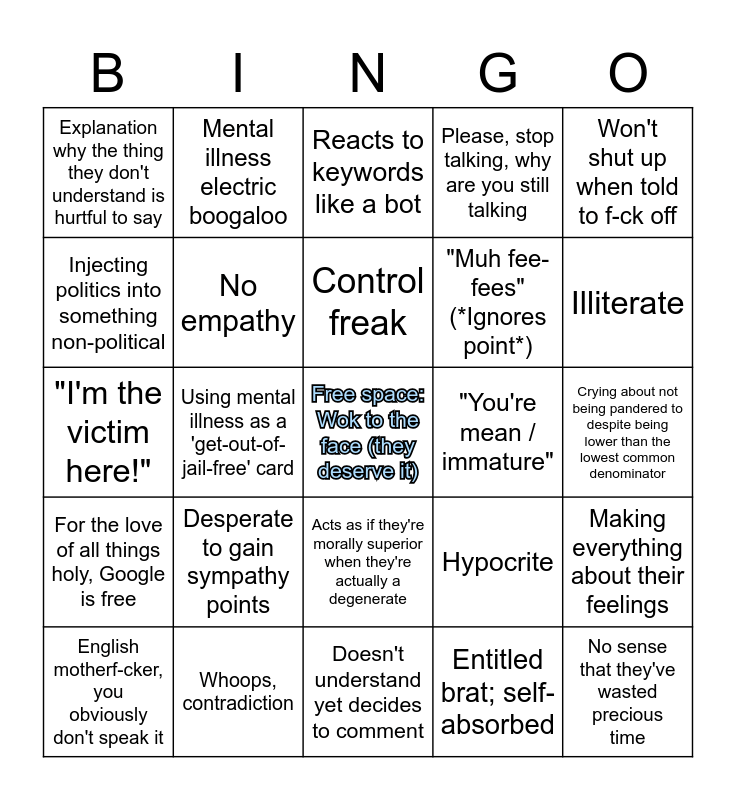 This bingo card has a free space and 27 words: Hypocrite, Massive walls of text, "Muh fee-fees" (*Ignores point*), Doesn't understand yet decides to comment, Injecting politics into something non-political, Reacts to keywords like a bot, Mental illness electric boogaloo, For the love of all things holy, Google is free, "You're mean / immature", Making everything about their feelings, "I'm the victim here!", Please, stop talking, why are you still talking, English motherf-cker, you obviously don't speak it, Whoops, contradiction, Illiterate, QwQ when yelled at for not reading or understanding, No empathy, Control freak, Desperate to gain sympathy points, Explanation why the thing they don't understand is hurtful to say, Crying about not being pandered to despite being lower than the lowest common denominator, Entitled brat; self-absorbed, Using mental illness as a 'get-out-of-jail-free' card, No sense that they've wasted precious time, Acts as if they're morally superior when they're actually a degenerate, Won't shut up when told to f-ck off and Tells life story, it's completely unrelated.