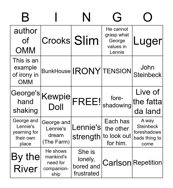 This bingo card has a free space and 24 words: George and Lennie's dream (The Farm), He shows mankind's need for companion-ship, IRONY, By the River, Luger, author of OMM, This is an example of irony in OMM, Crooks, fore- shadowing, Lennie's strength, TENSION, George's hand shaking, Each has the other to look out for him., A way Steinbeck foreshadows bads thing to come, BunkHouse, Carlson, Live of the fatta da land, Slim, John Steinbeck, Kewpie Doll, Repetition, George and Lennie's yearning for their own place, He cannot grasp what George values in Lennie and She is lonely, bored and frustrated.