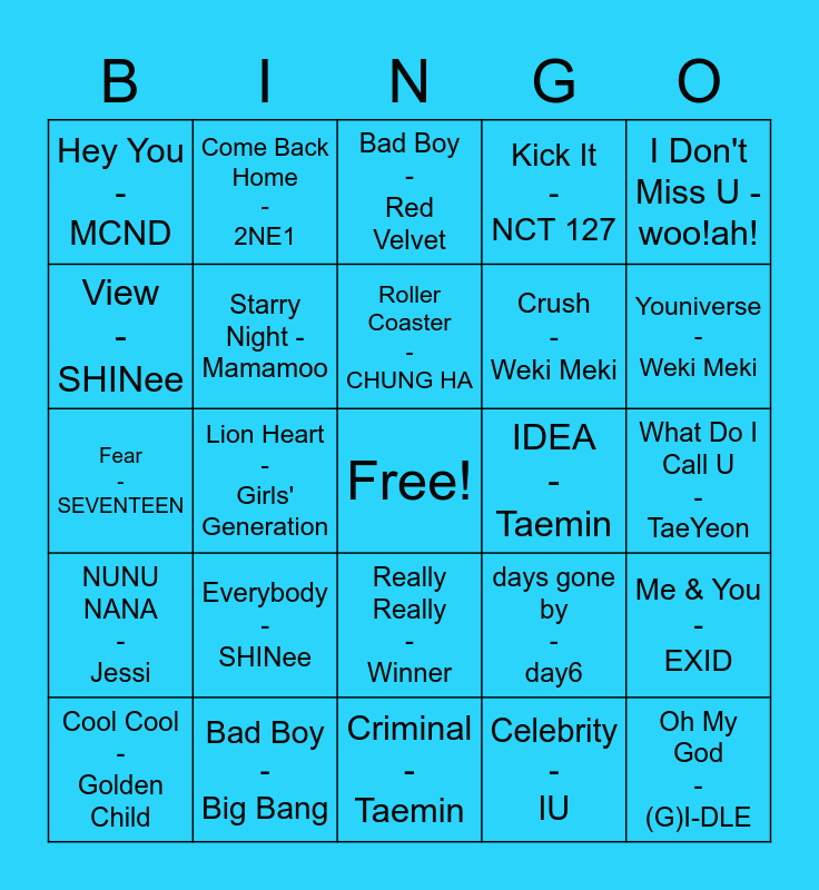 This bingo card has a free space and 24 words: Everybody - SHINee, Bad Boy - Big Bang, Roller Coaster - CHUNG HA, Cool Cool - Golden Child, I Don't Miss U - woo!ah!, Hey You - MCND, View - SHINee, Come Back Home - 2NE1, IDEA - Taemin, Really Really - Winner, Crush - Weki Meki, Fear -SEVENTEEN, days gone by - day6, Me & You - EXID, Starry Night - Mamamoo, Celebrity - IU, What Do I Call U - TaeYeon, Bad Boy - Red Velvet, Youniverse - Weki Meki, Lion Heart - Girls' Generation, Oh My God - (G)I-DLE, NUNU NANA - Jessi, Kick It - NCT 127 and Criminal - Taemin.
