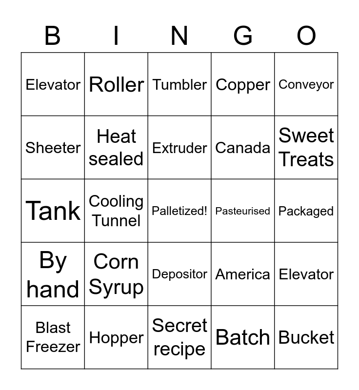 This bingo card has a free space and 26 words: Depositor, Batch, Extruder, Hopper, Conveyor, Elevator, Sheeter, Roller, Packaged, America, Canada, Tank, Elevator, Blast Freezer, Cooling Tunnel, Heat-sealed, Copper, By hand, Tumbler, Bucket, Sweet Treats, Secret recipe, Pasteurised, Corn Syrup, Heat sealed and Tanker.