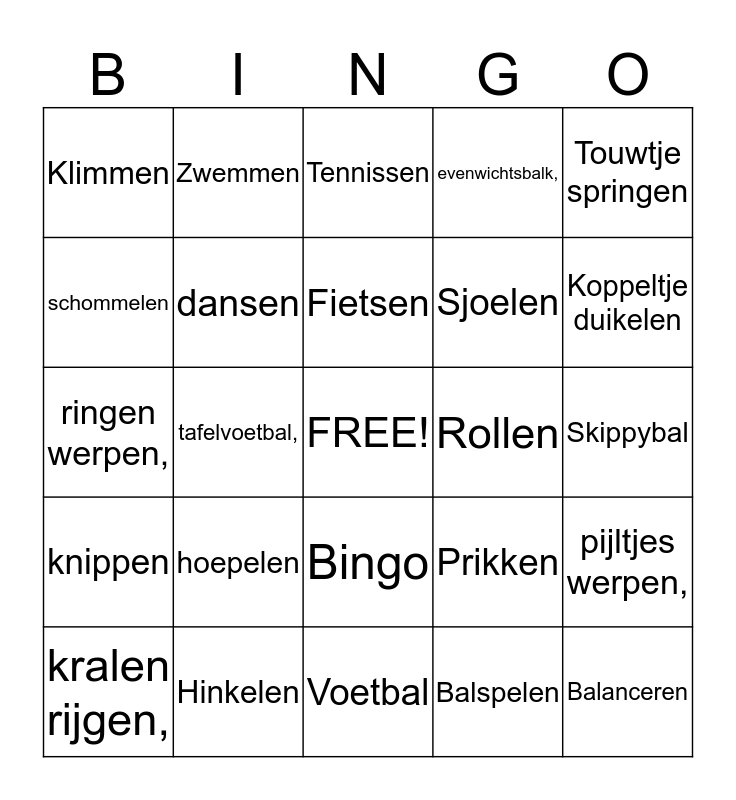 This bingo card has a free space and 26 words: Bingo, Balspelen, Fietsen, Hinkelen, Touwtje springen, Klimmen, schommelen, Zwemmen, Skippybal, Prikken, Sjoelen, ringen werpen,, pijltjes werpen,, kralen rijgen,, tafelvoetbal,, Twister, evenwichtsbalk,, knippen, Tennissen, Balanceren, Koppeltje duikelen, Voetbal, Rollen, hoepelen, dansen and tekenen.