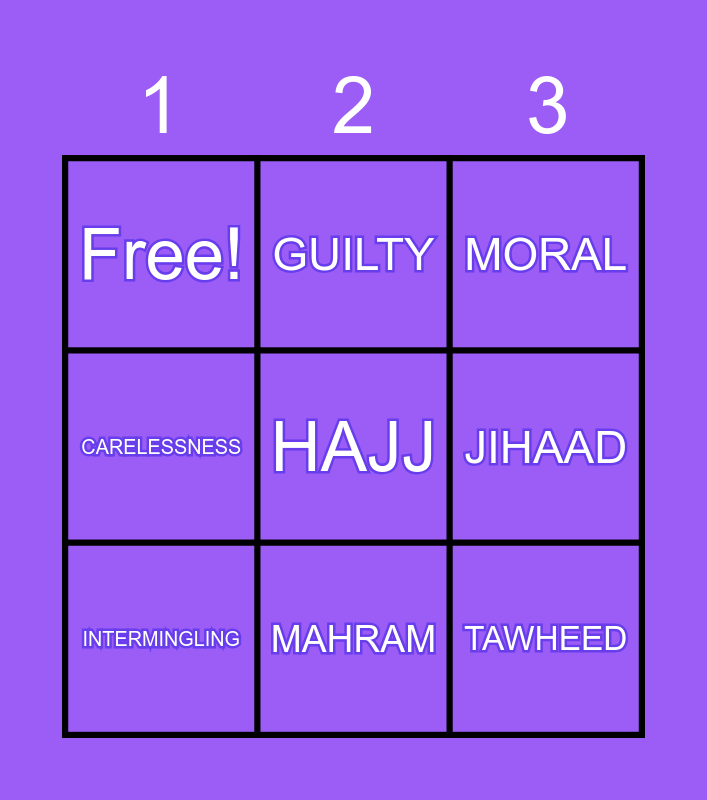 This bingo card has 9 words: INTERMINGLING, MORAL, GUILTY, CARELESSNESS, Free!, JIHAAD, HAJJ, TAWHEED and MAHRAM.
