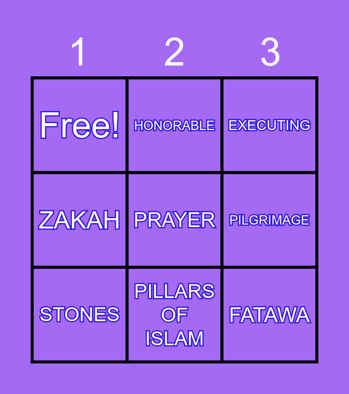 This bingo card has 9 words: STONES, EXECUTING, HONORABLE, ZAKAH, Free!, PILGRIMAGE, PRAYER, FATAWA and PILLARS OF ISLAM.