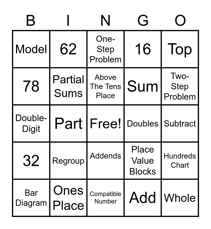 This bingo card has a free space and 24 words: Regroup, Ones Place, Above The Tens Place, Bar Diagram, Top, Model, 78, 62, Doubles, Addends, Sum, Double-Digit, Place Value Blocks, Hundreds Chart, Partial Sums, Add, Subtract, One-Step Problem, Two-Step Problem, Part, Whole, 32, 16 and Compatible Number.
