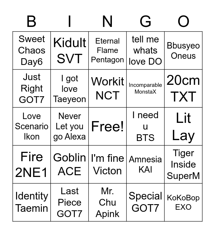 This bingo card has a free space and 24 words: Goblin ACE, Last Piece GOT7, Workit NCT, Identity Taemin, Bbusyeo Oneus, Sweet Chaos Day6, Just Right GOT7, Kidult SVT, I need u BTS, I'm fine Victon, Incomparable MonstaX, Love Scenario Ikon, Amnesia KAI, Tiger Inside SuperM, I got love Taeyeon, Special GOT7, Lit Lay, Eternal Flame Pentagon, 20cm TXT, Never Let you go Alexa, KoKoBop EXO, Fire 2NE1, tell me whats love DO and Mr. Chu Apink.