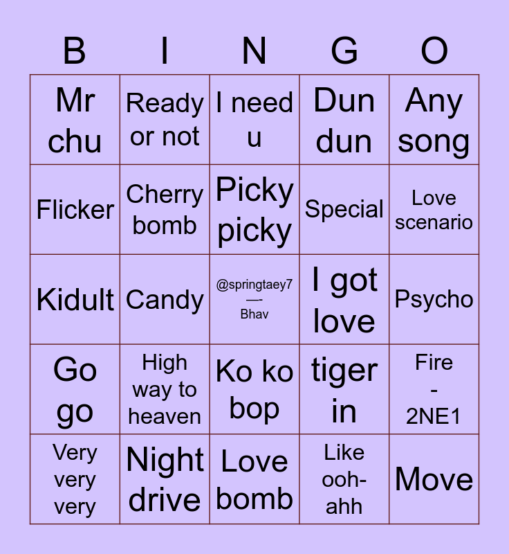 This bingo card has a free space and 24 words: High way to heaven, Night drive, Picky picky, Very very very, Any song, Mr chu, Flicker, Ready or not, I got love, Ko ko bop, Special, Kidult, tiger in, Fire - 2NE1, Cherry bomb, Like ooh-ahh, Psycho, I need u, Love scenario, Candy, Move, Go go, Dun dun and Love bomb.