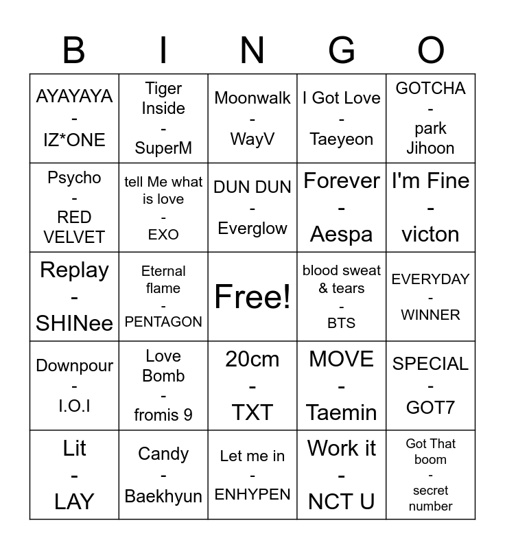 This bingo card has a free space and 24 words: Love Bomb - fromis 9, Candy - Baekhyun, DUN DUN - Everglow, Lit - LAY, GOTCHA - park Jihoon, AYAYAYA - IZ*ONE, Psycho - RED VELVET, Tiger Inside - SuperM, blood sweat & tears - BTS, 20cm - TXT, Forever - Aespa, Replay - SHINee, MOVE - Taemin, SPECIAL - GOT7, tell Me what is love - EXO, Work it - NCT U, EVERYDAY - WINNER, Moonwalk - WayV, I'm Fine - victon, Eternal flame - PENTAGON, Got That boom - secret number, Downpour - I.O.I, I Got Love - Taeyeon and Let me in - ENHYPEN.