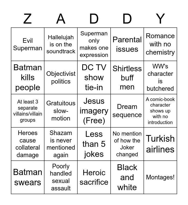 This bingo card has a free space and 24 words: Shazam is never mentioned again, Poorly handled sexual assault, DC TV show tie-in, Batman swears, Romance with no chemistry, Evil Superman, Batman kills people, Hallelujah is on the soundtrack, Dream sequence, Less than 5 jokes, Shirtless buff men, At least 3 separate villains/villain groups, No mention of how the Joker changed, Turkish airlines, Objectivist politics, Black and white, A comic-book character shows up with no introduction, Superman only makes one expression, WW's character is butchered, Gratuitous slow-motion, Montages!, Heroes cause collateral damage, Parental issues and Heroic sacrifice.