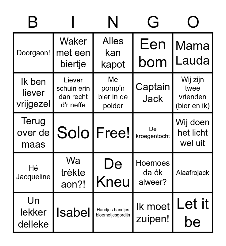 This bingo card has a free space and 29 words: Un lekker delleke, Stripke veur, Solo, Grozzie van men buurvrouw, Doorgaon!, Alles kan kapot, Liever schuin erin dan recht d'r neffe, Wa trèkte aon?!, De kroegentocht, Isabel, Wij doen het licht wel uit, Let it be, Handjes handjes bloemetjesgordijn, Ik moet zuipen!, Wij zijn twee vrienden (bier en ik), Melken doe je zo, De Kneu, Hé Jacqueline, Mama Lauda, Terug over de maas, Hoemoes da ók alweer?, Mèn niet bellen, Captain Jack, Ik ben liever vrijgezel, Een bom, Waker met een biertje, Alaafrojack, Me pomp'n bier in de polder and Hela hola.