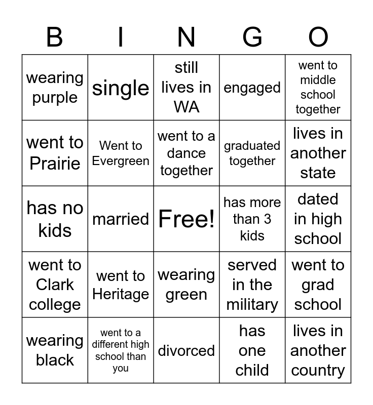 This bingo card has a free space and 24 words: went to Heritage, went to a different high school than you, went to a dance together, wearing black, went to middle school together, wearing purple, went to Prairie, single, has more than 3 kids, wearing green, graduated together, has no kids, served in the military, went to grad school, Went to Evergreen, has one child, dated in high school, still lives in WA, lives in another state, married, lives in another country, went to Clark college, engaged and divorced.